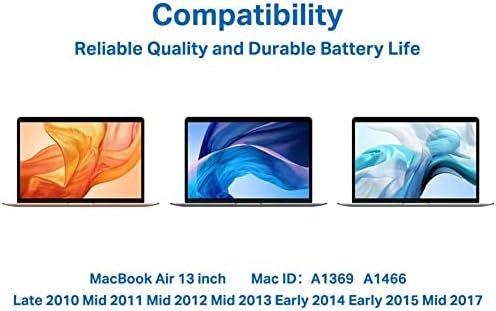 - Replacement Battery for MacBook Air: Made for MacBook Air 13 inch A1466 (Mid 2012, Mid 2013, Early 2014, Early 2015, 2017 Version), A1369 (Late 2010, Mid 2011 Version), MC503LL/A, MC504LL/A, MC965LL/A, MC966LL/A, MD231LL/A, MD232LL/A, MD760LL/A, MD761LL/A, MD760LL/B, MD761LL/B, MJVE2LL/A, MJVG2LL/A. EMC Applicable number: 2469/2559(see compatible models)