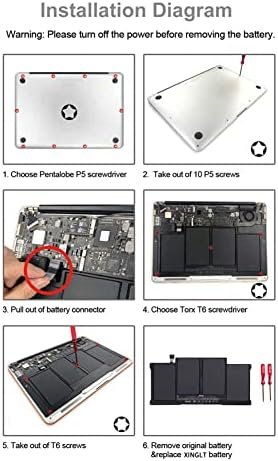 - New Upgrade 3.0 Quality: Battery for macbook air 13 inch with Japan High Performance Electric Core, 7200mAh Voltage:7.4V Capacity: 53.28Wh(Compatible with 7.6V/55Wh and 7.4V/53.28Wh) Package include: 1 x Macbook battery; 1 x keyboard protective film; 2 x screwdrivers; 4 x helper mat; 10 x replacement screws.